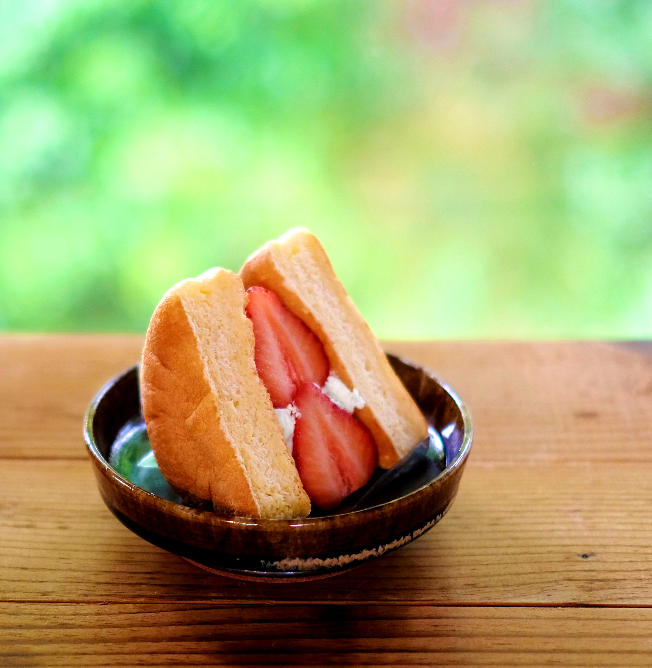 踊せんべいの材料を使用してふわふわに焼き上げたパンケーキ。あさっり仕上げた純生クリームと苺をサンドしました。※季節に応じたフルーツや丹波栗のモンブランサンド、粒あんをサンドした商品展開もございます。
