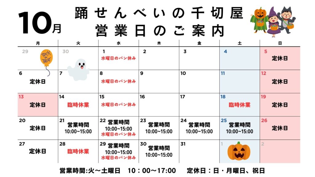 2025年10月の弊店(ちきり屋本店)営業日を下記の通りご案内申し上げます。